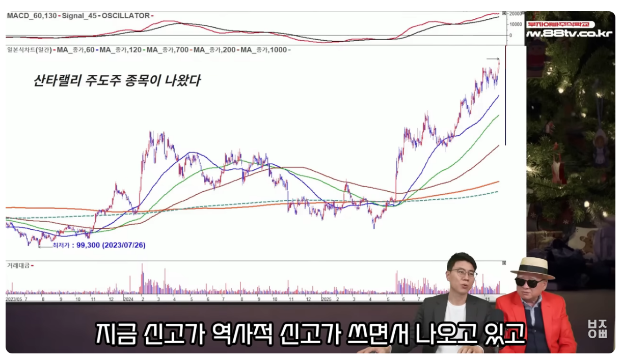 얼마 전에 88TV아빠님이 산타랠리를 앞두고 세 종목을 추천하셨어요. 그중에 한 종목을 살펴보려고 합니다. 저는 이미 계좌에 몇 년 째 보유 중이고, 수익률 좋은 종목이에요. 아래 차트는 일봉 차트로 보입니다.